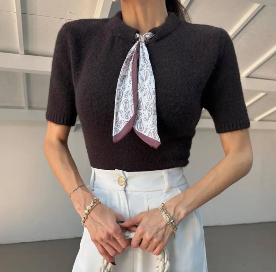 بلوز صوف ناعم سادة نص كم مع سكارف